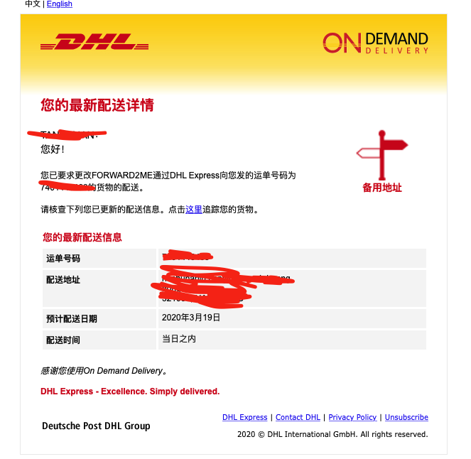 6.付款完成后会收到DHL的运单信息,可以实时追踪