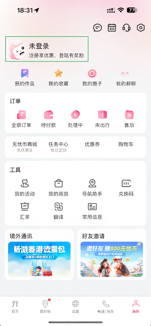 2、打开“无忧行“App,点击“我的”,点击“未登录”。