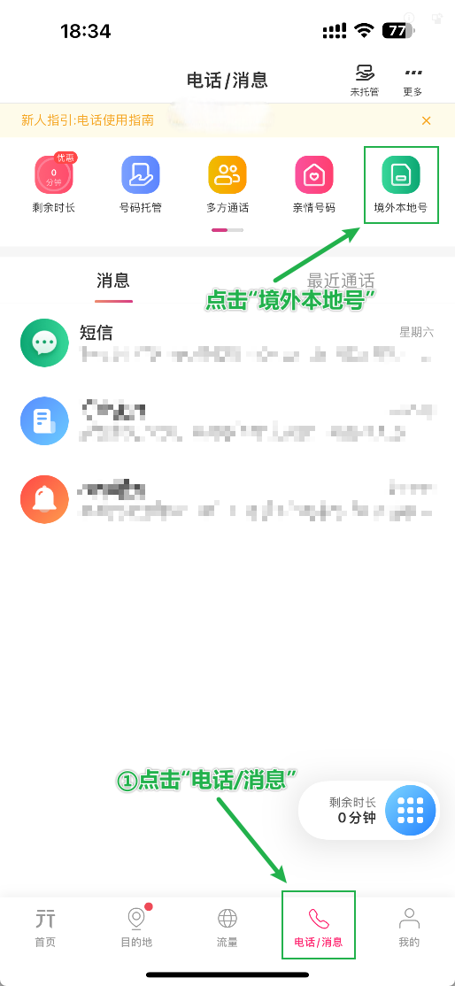 4、点击最下方导航栏的“电话/消息”,然后点击“境外本地号”。