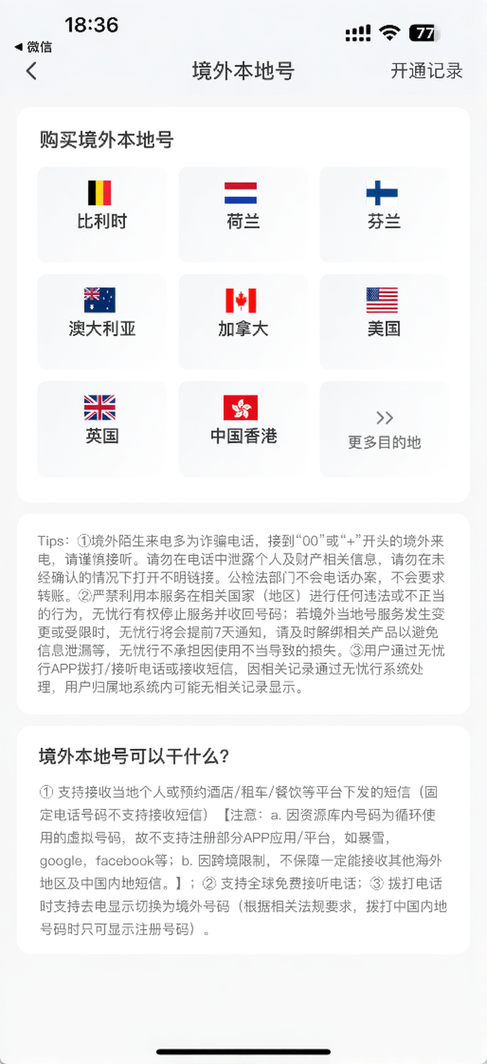 A:截止到2024年7月1日,无忧行支持香港、比利时、美国、加拿大、英国、澳大利亚、芬兰和荷兰手机号码的购买。