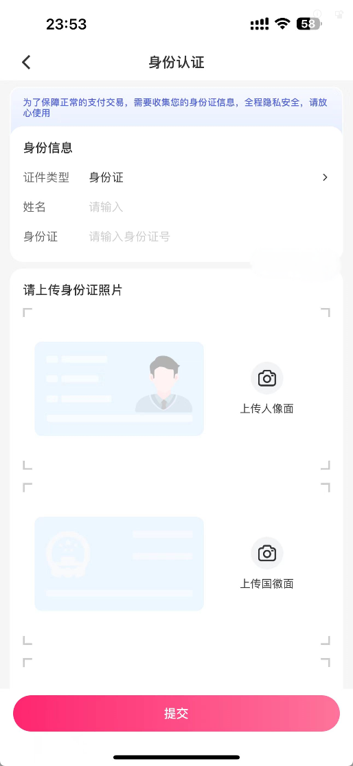 (3)输入姓名、身份证号,然后根据提示拍摄身份证正面、反面、手持身份证照片,点击“提交”即可。
