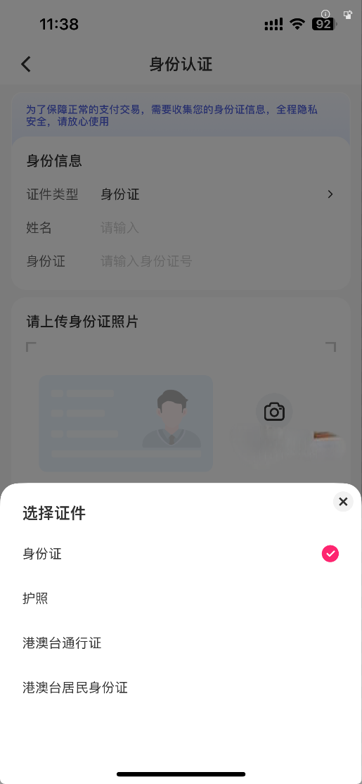(2)选择合适的证件进行实名。